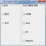 public class BoxLayoutTest extends JFrame { public BoxLayoutTest() {super("Box Layout Test example");JRadioButton r1, r2; setLayout(new BorderLayout());Box left = Box.createVerticalBox();left.add(Box.createVerticalStrut(30)); ButtonGroup radioGroup = new ButtonGroup();radioGroup.add(r1 = new JRadioButton("야구"));left.add(r1); left.add(Box.createVerticalStrut(30));radioGroup.add(r2 = new JRadioBut..