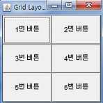 class GridLayoutTest extends Frame {public GridLayoutTest(String str) {super(str); Button btn[] = new Button[6]; setLayout(new GridLayout(3,2));for (int i = 0; i < 6; i++) {btn[i] = new Button((i + 1) + "번 버튼");add(btn[i]);}setSize(200, 200);setVisible(true); }} public class GridLayoutMain { public static void main(String[] args) {// TODO Auto-generated method stubnew GridLayoutTest("Grid Layout..