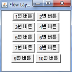 class FlowLayoutTest extends Frame {public FlowLayoutTest(String str) {super(str); FlowLayout fl = new FlowLayout();Button btn[] = new Button[10]; setLayout(fl);for (int i = 0; i < 10; i++) {btn[i] = new Button((i + 1) + "번 버튼");add(btn[i]);}setBounds(100, 100, 200, 200);setVisible(true);}} public class FlowLayoutMain { public static void main(String[] args) {// TODO Auto-generated method stubne..